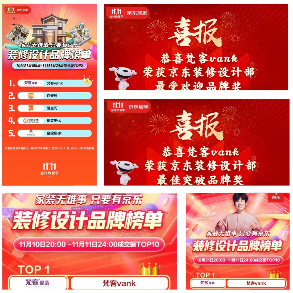 在去年京東11.11全球熱愛季,梵客家裝更是殊榮卓著,穩(wěn)拿首日開門紅熱賣榜,11.1-11.11期間熱賣榜,11.11全天熱賣榜三個NO.1;喜獲京東裝修設(shè)計部最受歡迎品牌獎和最佳突圍品牌獎兩大獎項;登頂京東裝修設(shè)計品牌榜單,并實現(xiàn)在京城業(yè)績連年翻倍增長!此外,梵客家裝還與眾多大牌同時榮登品牌龍虎榜單TOP10,成為家裝行業(yè)唯一上榜品牌。