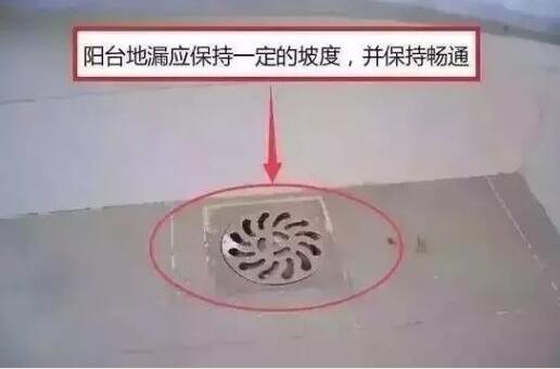 二、陽臺、衛(wèi)生間的地漏需要保持一定的坡度,這樣干得快,并且要做到不積水。