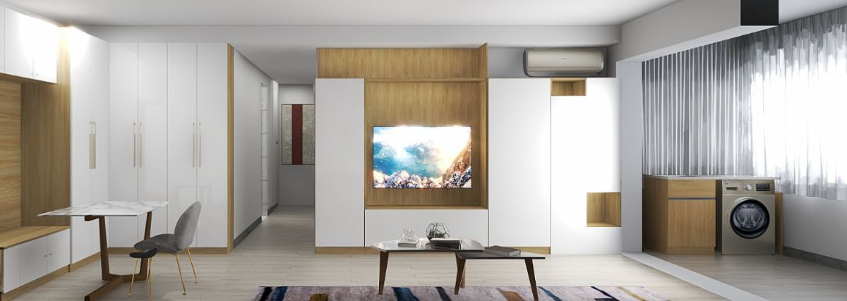↑ 客廳,收納柜與電視背景墻結合,將儲物做到極致。抽屜以及不同大小的柜子,方便各類物品的存放。嵌入式空調的設計,更整體統一 ,提升空間整潔度。